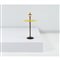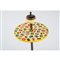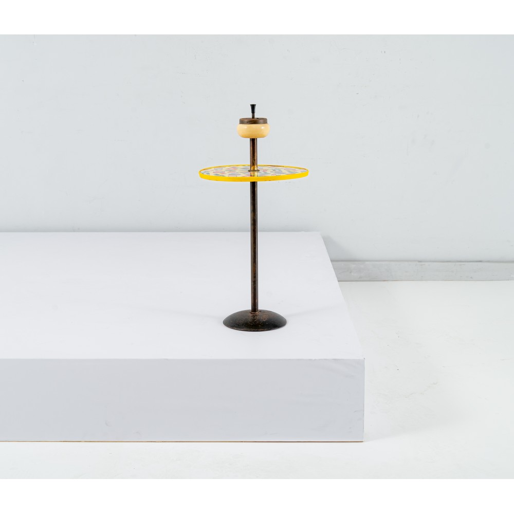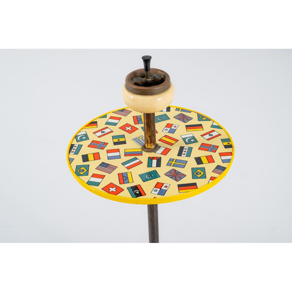 Piccolo tavolo con struttura in tubolare metallico brunito , piano circolare in acrilico giallo decorato con bandiere, un posacenere sulla parte superiore. Ossidazioni.