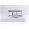 Tavolo basso con corpo circolare in tubolare di acciaio cromato composto da quattro elementi a telaio chiuso, piano in vetro trasparente.