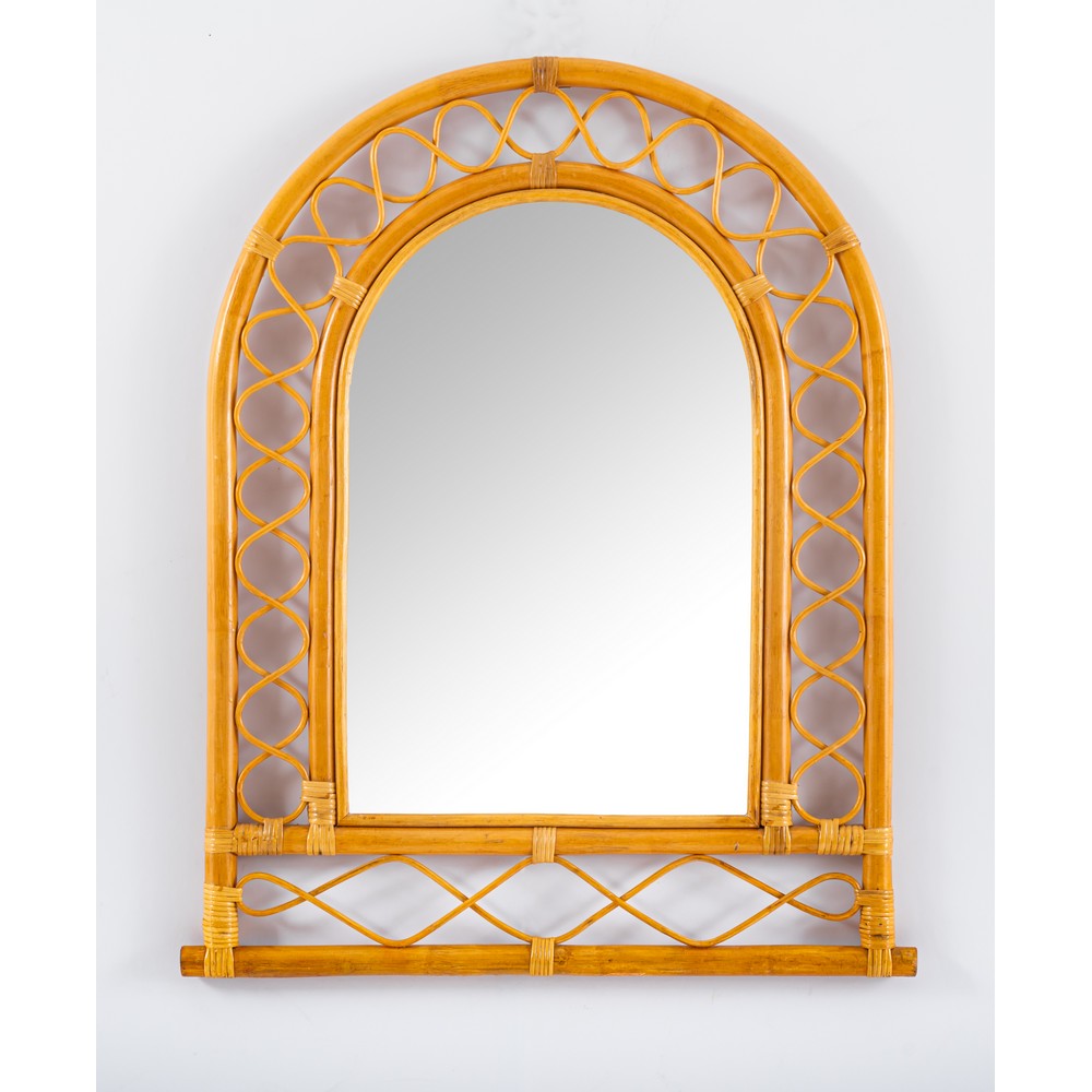 Specchio da parete in canna di bambù, corpo arcato con cornice ad intreccio e cristallo specchiato.