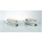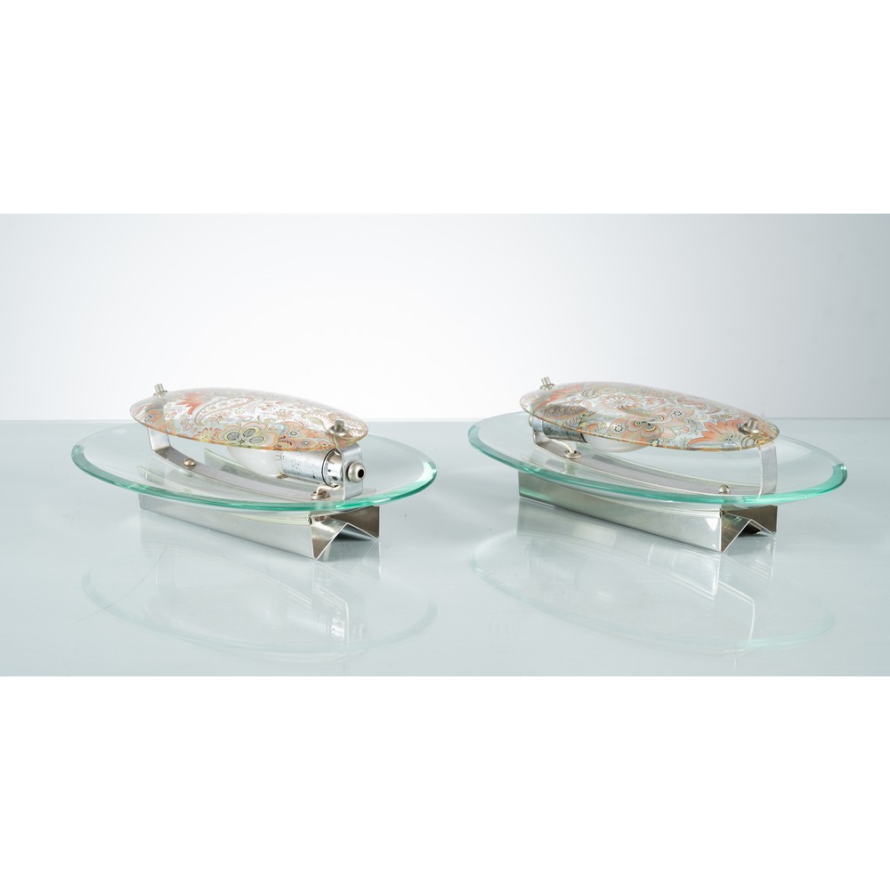 Coppia di lampade da parete ad una luce, struttura in metallo cromato, diffusori in cristallo ovale trasparente e decorato a motivi floreali arancione. Giunti in metallo cromato.