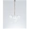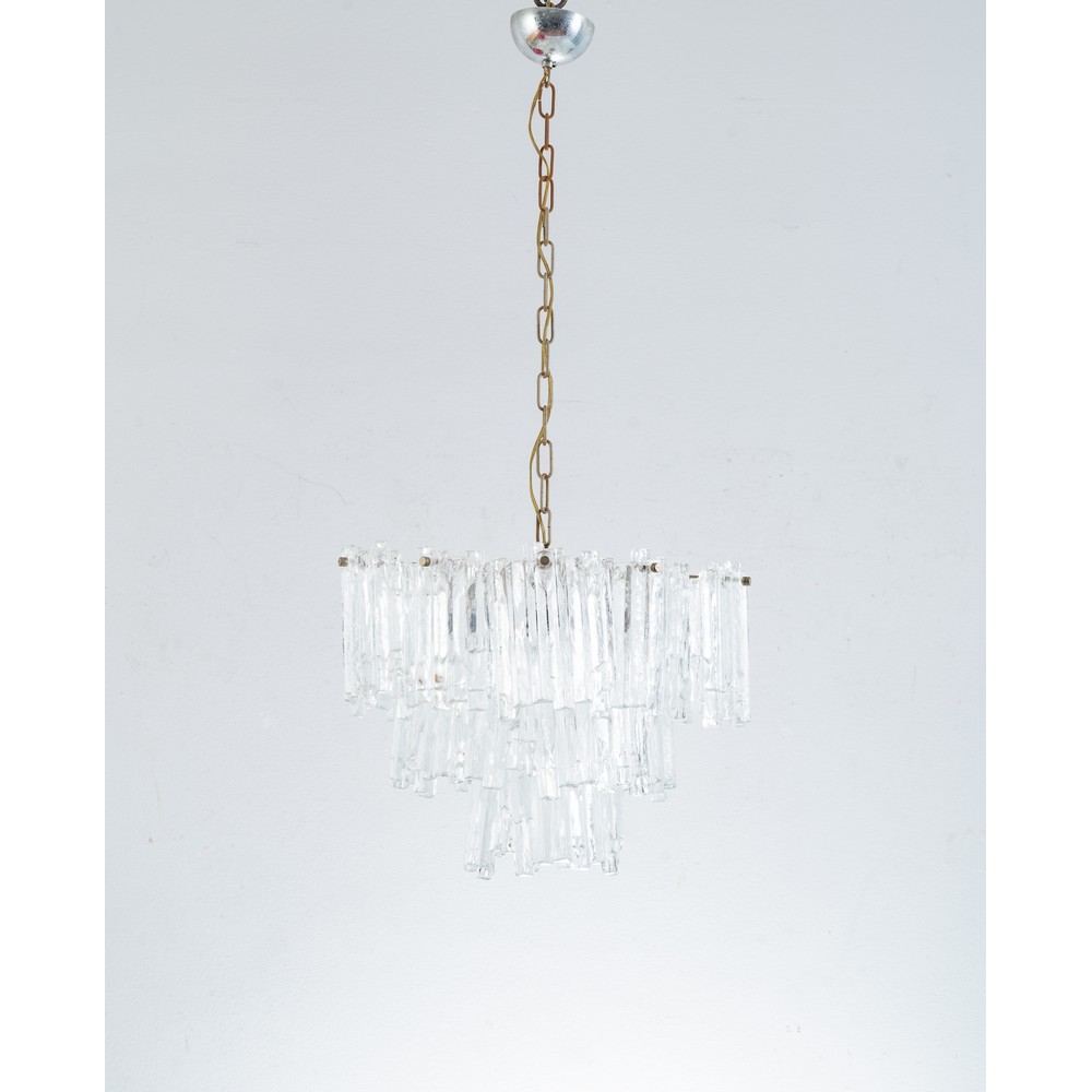 Lampada a sospensione a tre luci, struttura in metallo cromato, corpo circolare su tre piani decrescenti, diffusore composto da elementi modulari in vetro trasparente.