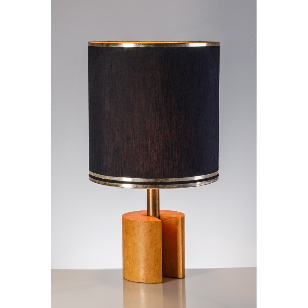 Lampada da tavolo ad una luce, corpo cilindrico in legno massello di radica, stelo in ottone nichelato, paralume tessuto nero con bordo argentato.