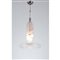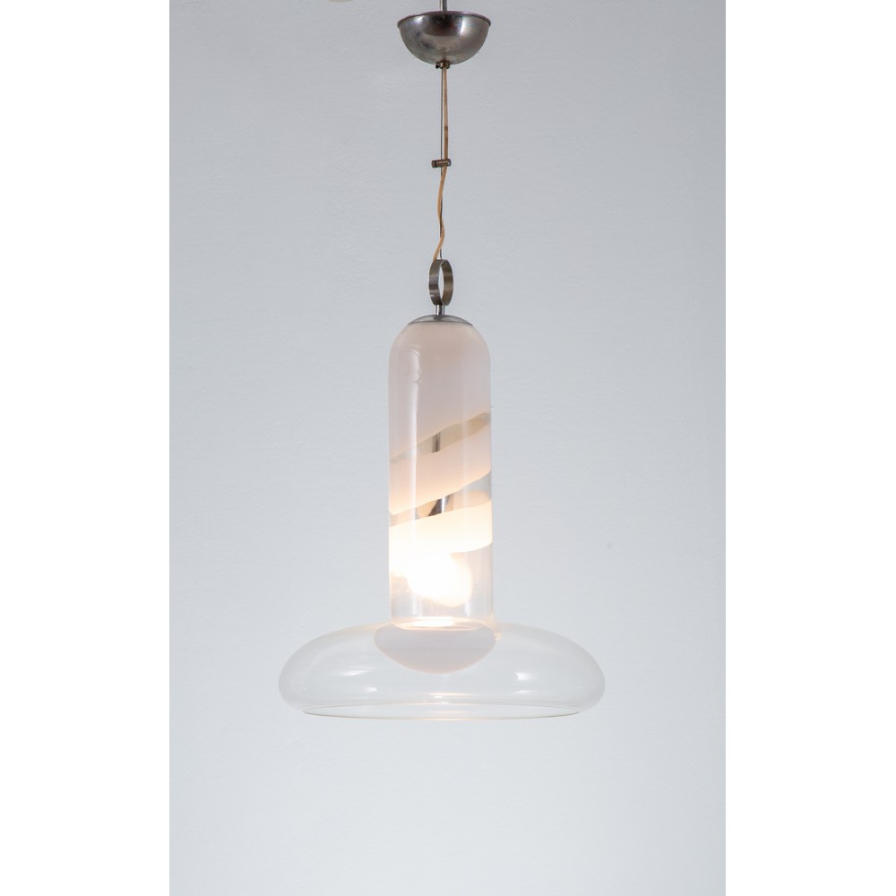 Lampada a sospensione ad una luce, diffusore circolare in vetro trasparente e decorato con grossa murrina in vetro lattimo.