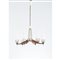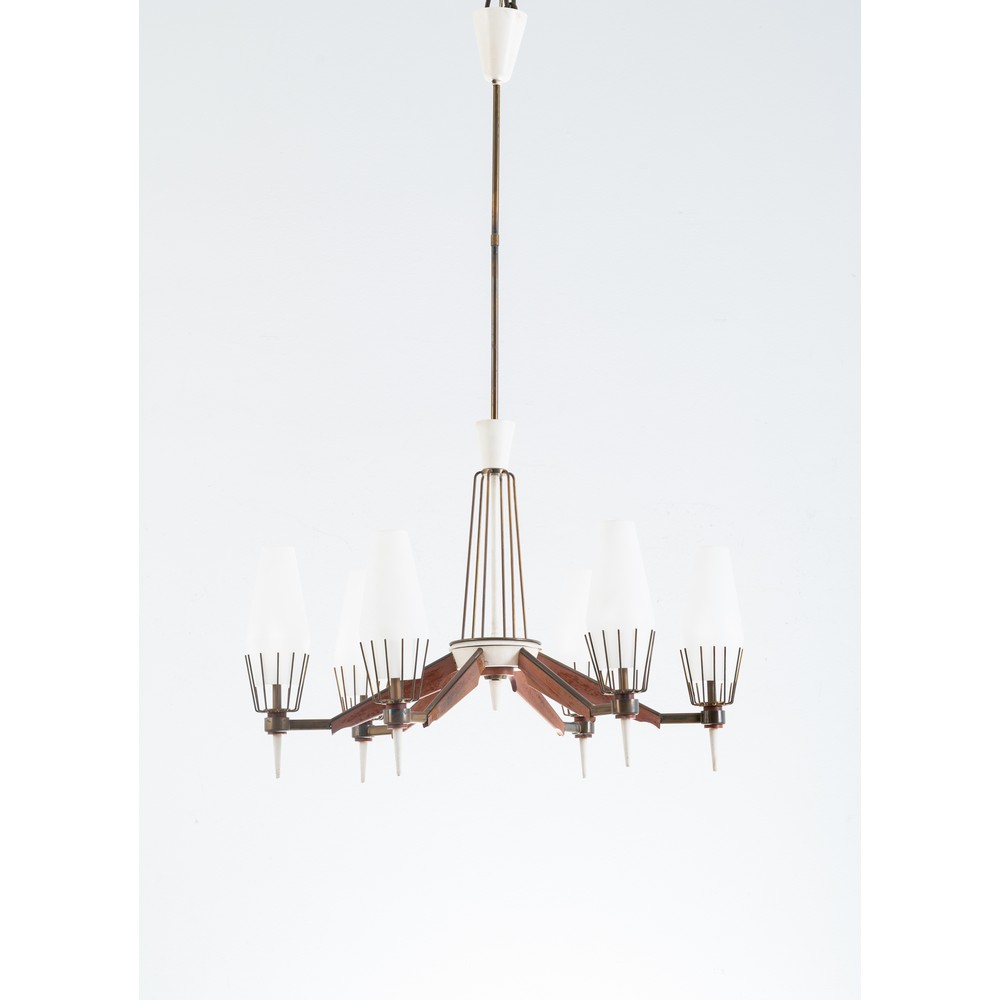 Lampada a sospensione a sei luci, bracci in legno e ottone con diffusori conici in vetro satinato bianco.