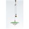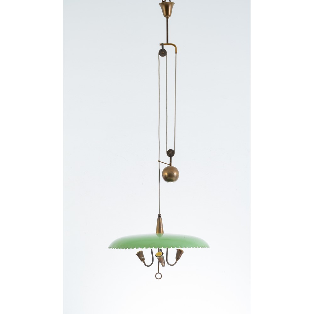 Lampada da soffitto a tre luci “Sali e Scendi”, struttura in ottone, tre bracci con portalampada a forma di fiore, diffusore in metallo verniciato verde, decori in ottone.