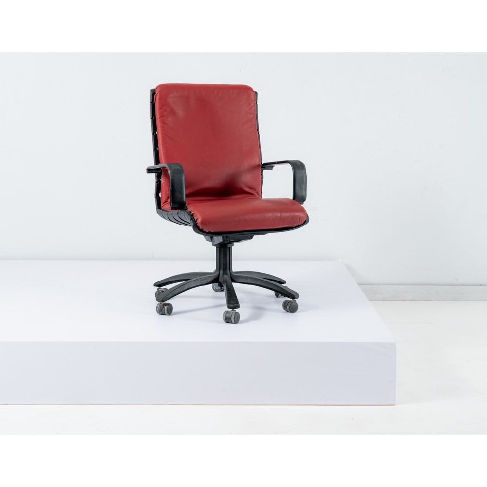 Poltrona modello “Atropovarius” con struttura in fibra di carbonio, seduta e spalliera in pelle bordeaux, poggioli in pelle nera. Struttura girevole su sei ruote. Marchio di produzione.