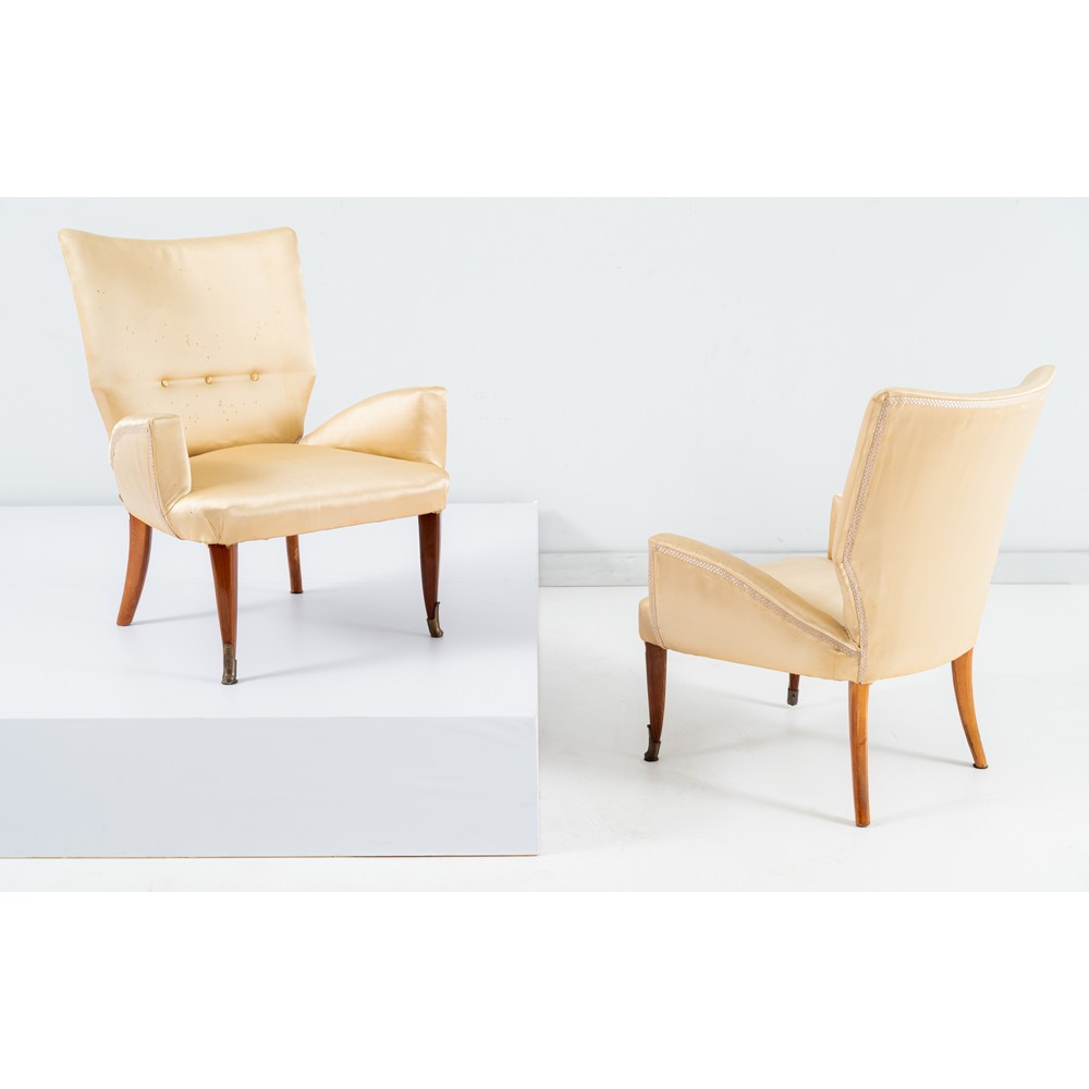 Coppia di poltrone con struttura in legno, imbottitura e rivestimento in tessuto champagne, piedi in legno curvato con scarpetta in ottone.