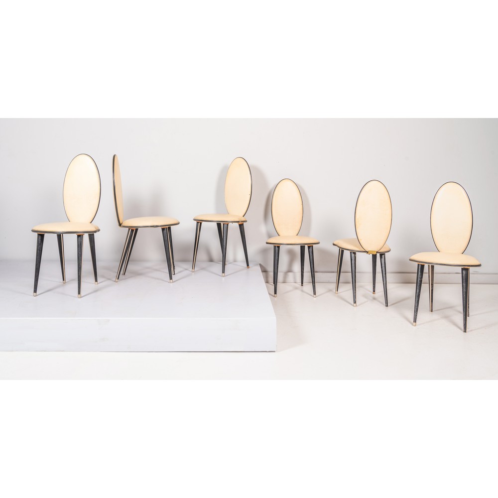 Sei sedie in legno rivestite in skai nei toni crema e nero, metallo dorato, spalliera ovale, gambe coniche rivestite in pelle. Difetti alle gambe.