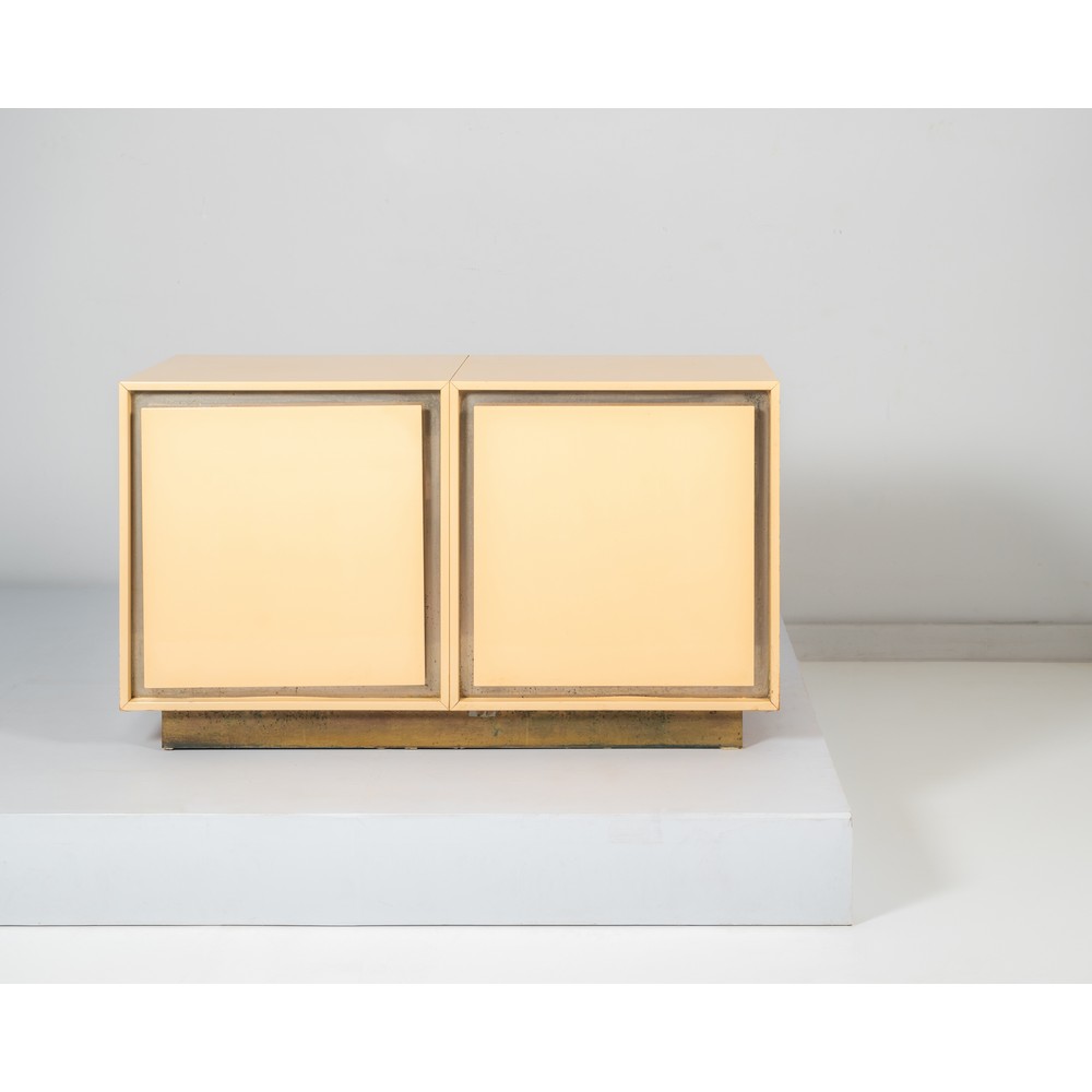 Sideboard in legno laccato avorio, due vani con anta battente, rifiniture in ottone (usure).