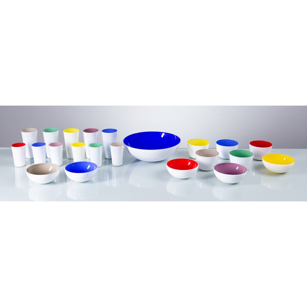 Parte di servizio in vetro incamiciato lattimo e di colori differenti così suddiviso, una ciotola grande, cinque ciotole medie, sei ciotoline, cinque bicchieri acqua, sei bicchieri vino.
