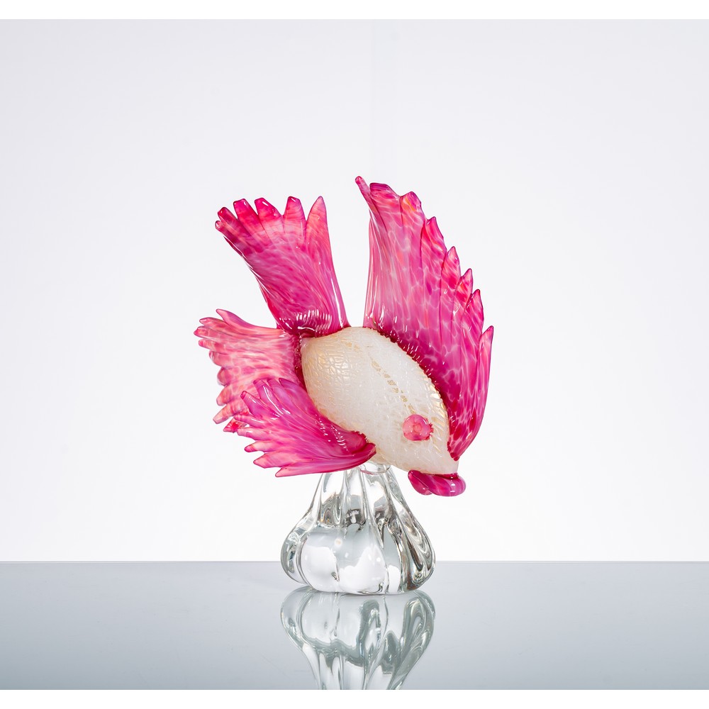 Scultura di pesce in vetro di Murano bianco opalescente con dorature, rosa marmorino, base trasparente.