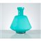 Vaso in vetro incamiciato verde, corpo sagomato e bombato con forti squadrature, collo lungo, bocca piana circolare, base circolare.