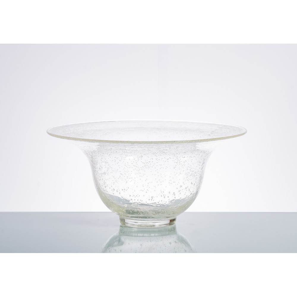 Grande coppa in vetro di Murano trasparente e bullicante, corpo a campana, base circolare.