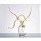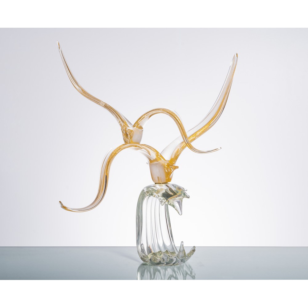 Una scultura di due uccelli in volo in vetro lattimo e oro su onda in vetro trasparente.