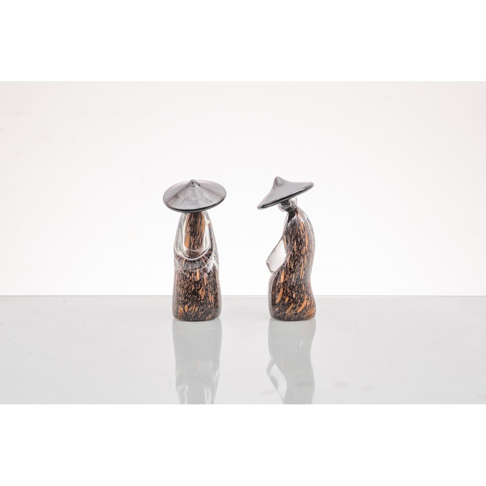 Coppia di sculture di figure orientali in vetro sommerso con avventurina, cappelli in vetro calcedonio.