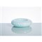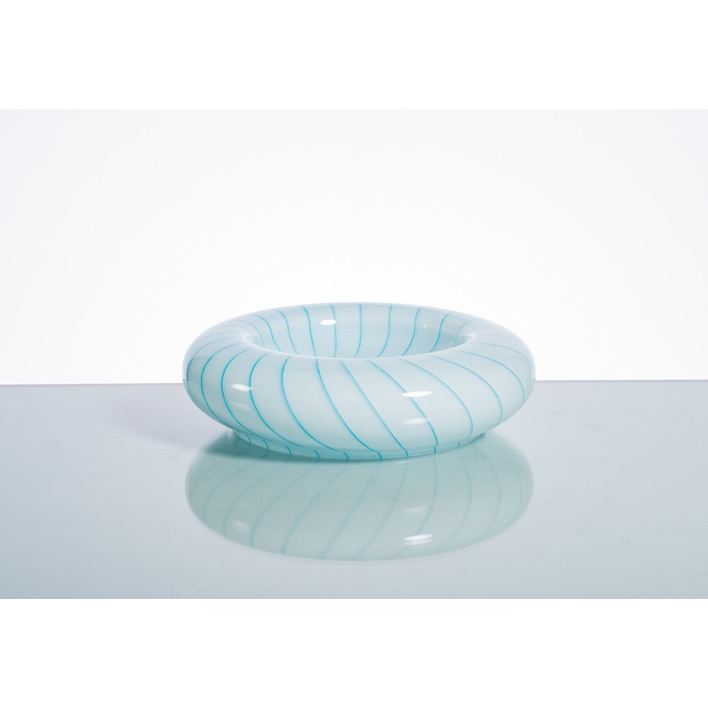 Centrotavola in vetro azzurrino decorato con canne filiformi turchesi, corpo circolare con convessità centrale.