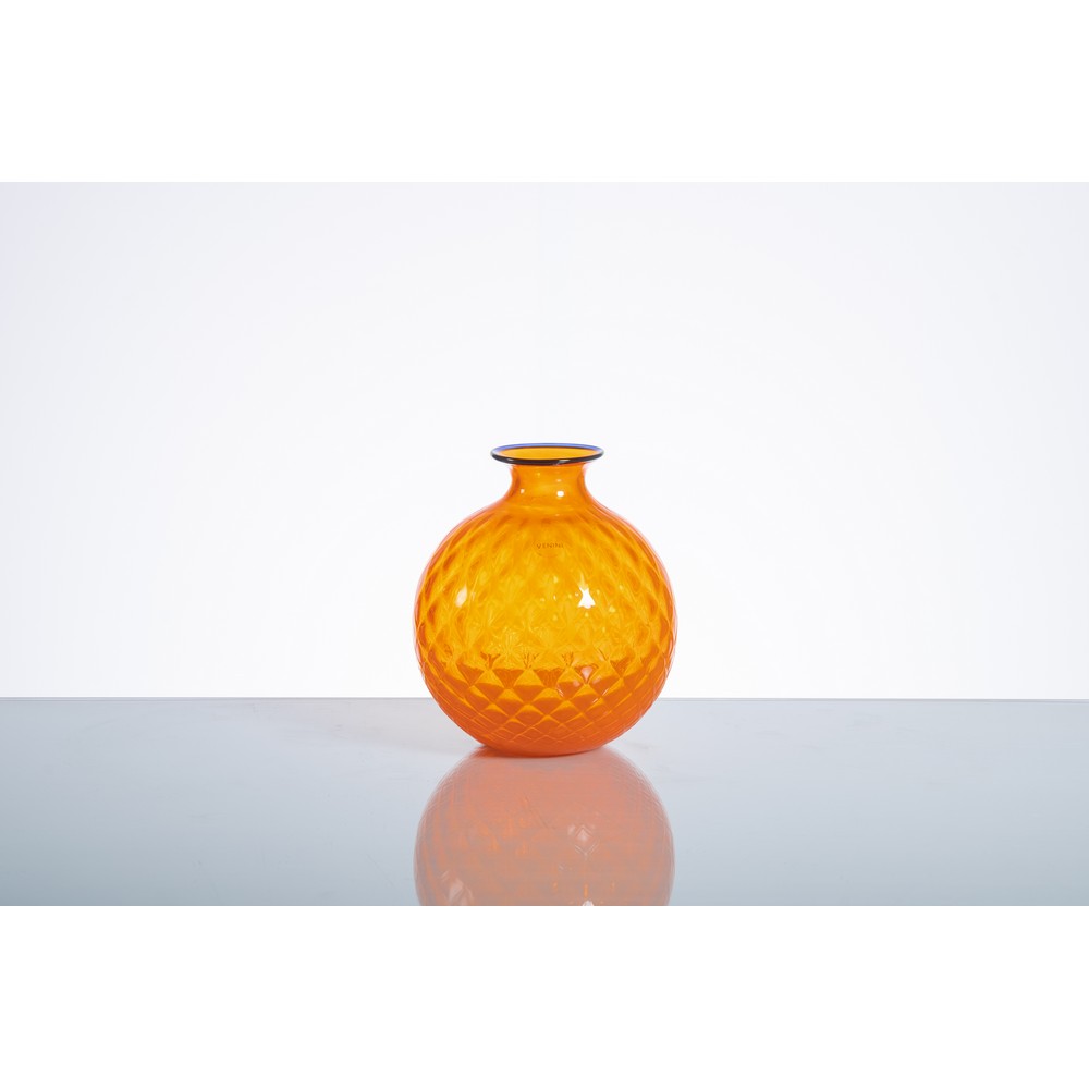 Vaso solifleur “Balloton” in vetro soffiato nei toni dell’arancione con perfilo sulla bocca blu, corpo globulare con basso collo e bocca circolare lievemente estroflessa. Firma alla base.
