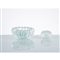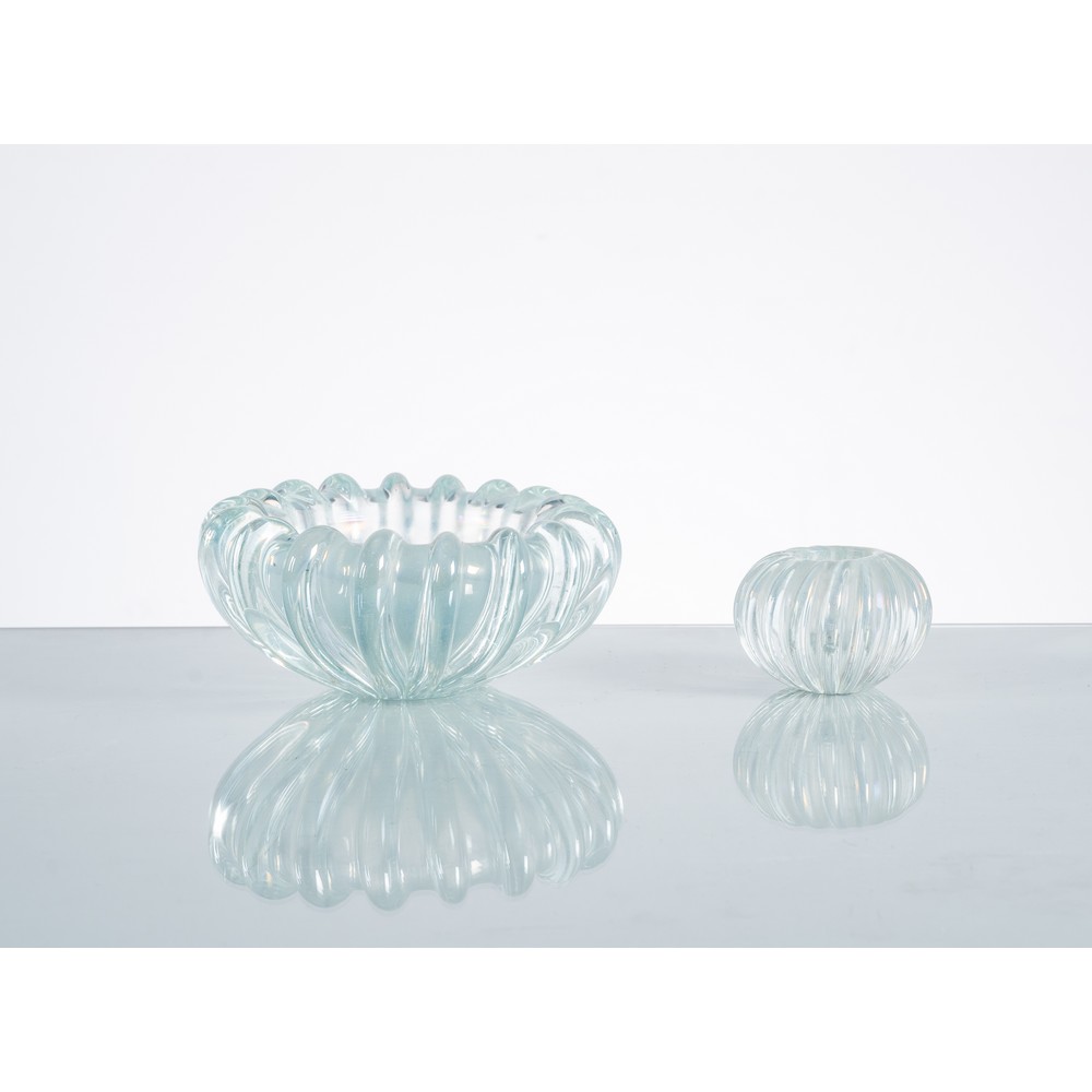 Una coppa in vetro costolato trasparente con corpo circolare, un portacandela in vetro costolato trasparente con corpo sferico.