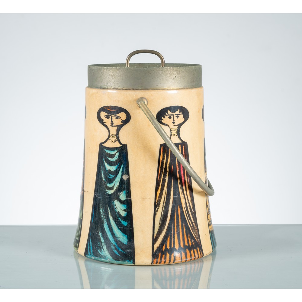 Secchiello portaghiaccio con corpo cilindrico rivestito in pergamena avorio e decorata con figure femminili policrome, interno termico, coperchio e manico in metallo dorato.