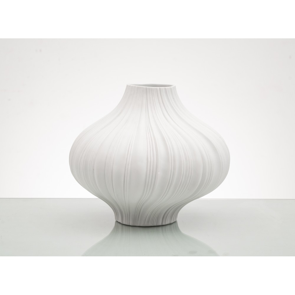 Vaso in porcellana bianca decorato con rigature longitudinali, corpo sferico ristretto agli estremi, bocca e base circolare.