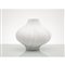 Vaso in porcellana bianca decorato con rigature longitudinali, corpo sferico ristretto agli estremi, bocca e base circolare.