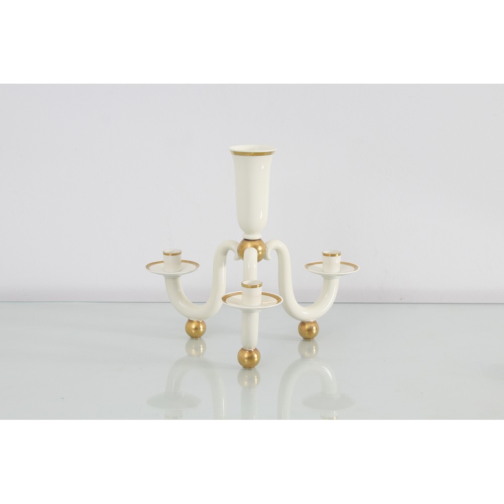Candelabro centrotavola a tre luci in porcellana bianca con decoro oro, vaso centrale a tulipano, piedi sferici. Marchio di produzione.