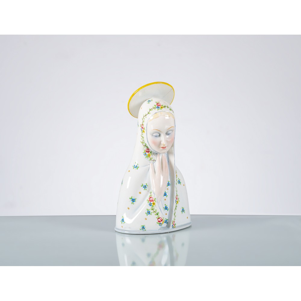 Scultura in ceramica con busto di Madonna decorata in policromie, firma sulla base. Filè sull’aureola.