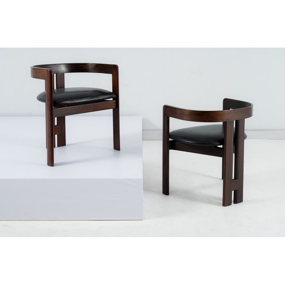 Coppia di sedie modello "Pigreco" in legno di noce scuro, seduta rivestita in pelle nera.
