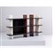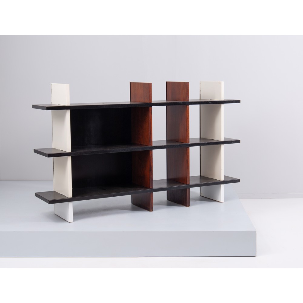 Libreria in legno composta da mensole e fianchi in legno finitura noce, laccato nero e bianco.