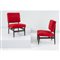 Coppie di poltrone con struttura in legno esotico, seduta e spalliera con imbottitura e rivestite con tessuto nei toni del rosso.