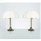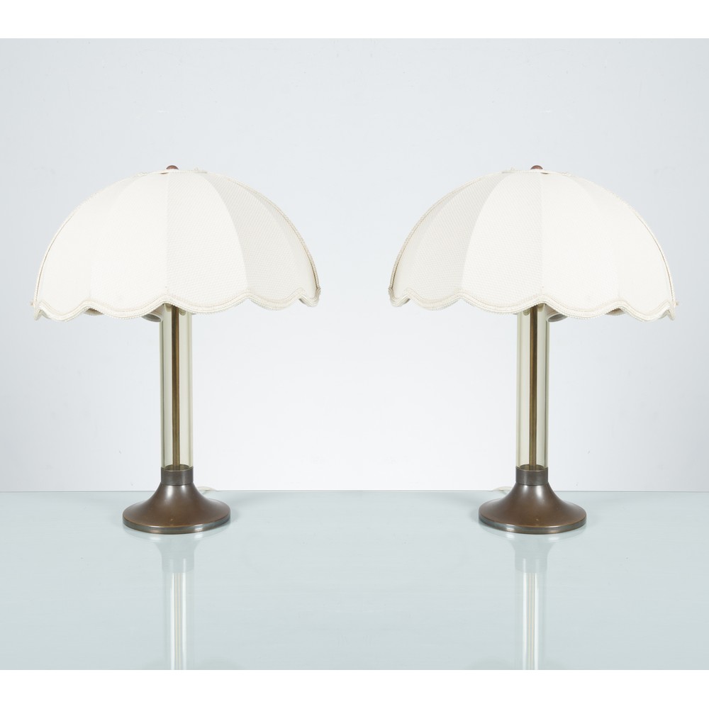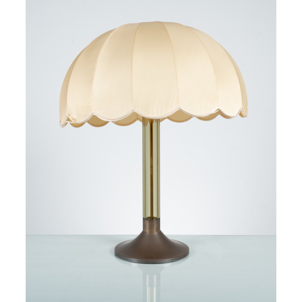 Tre lampade da tavolo a due luci, due di uguali dimensioni ed una più grande; struttura in ottone brunito con fusto cilindrico in plexiglass verde, base circolare. Paralume in tessuto semisferico color avorio.