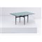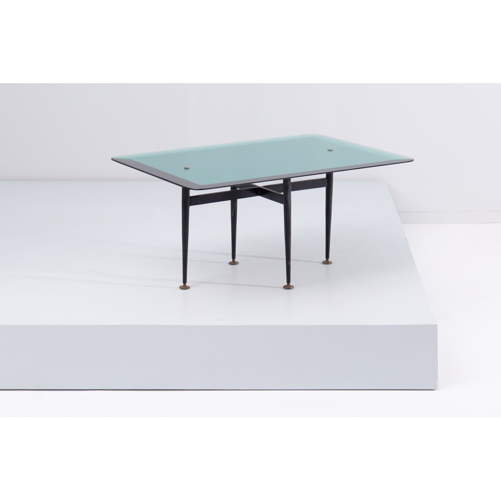 Tavolo basso con struttura in vetro verniciato nero e piede circolare in ottone, piano rettangolare a vassoio in vetro specchiato verde Nilo.