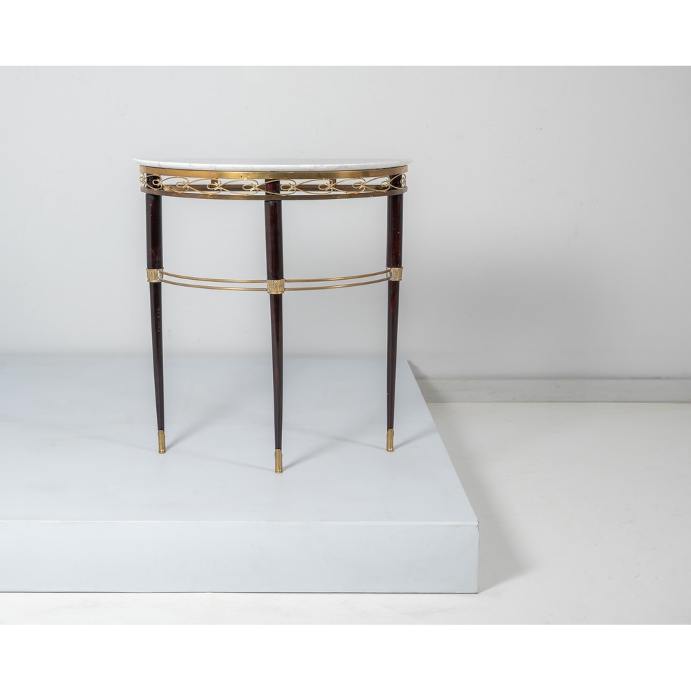 Consolle a mezza luna in legno ebanizzato, decori in ottone lucido sul fronte e sulle gambe, piano in marmo di Carrara.