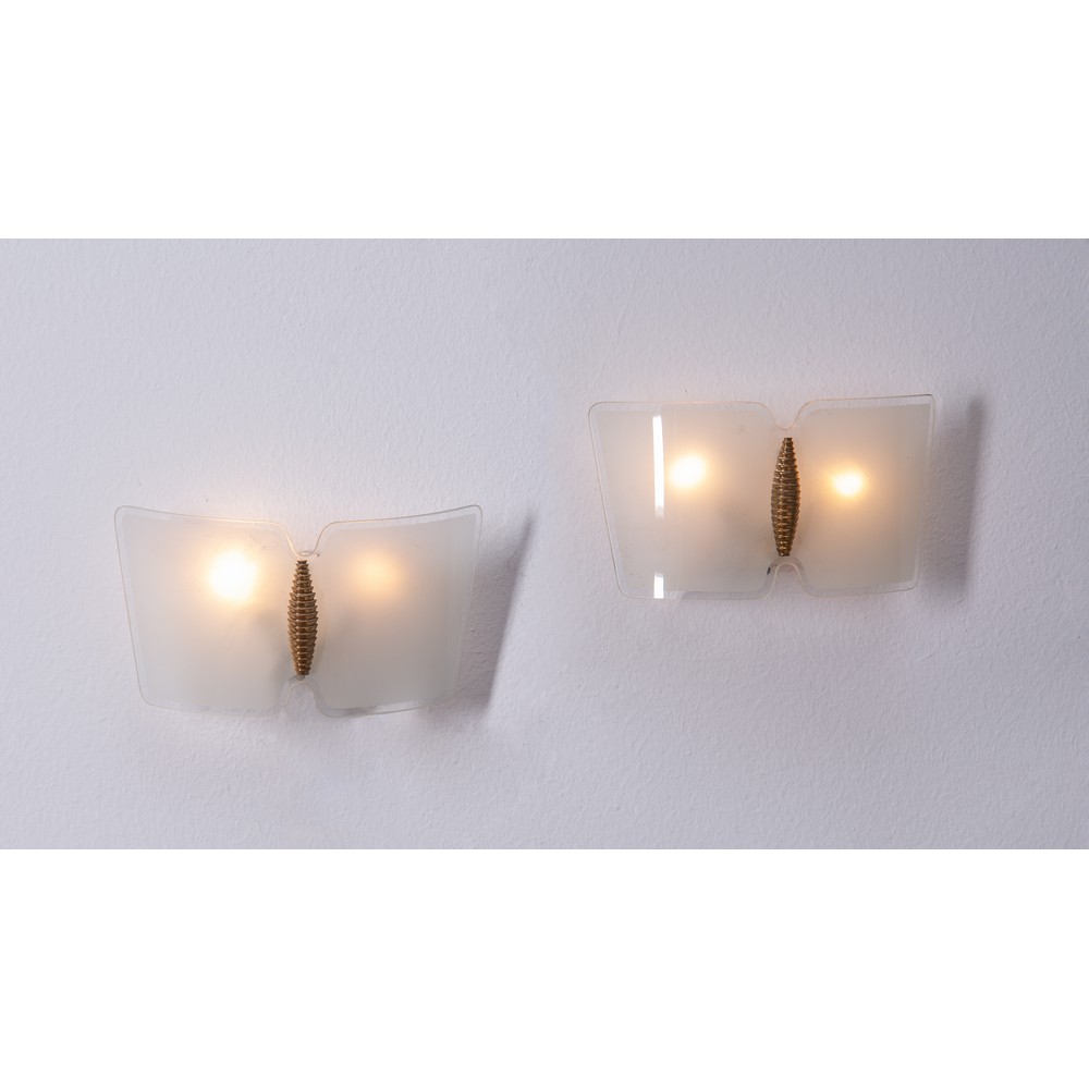 Coppia di lampade da parete a due luci in vetro satinato e curvato con bordo trasparente, elemento di raccordo centrale in ottone lucido.