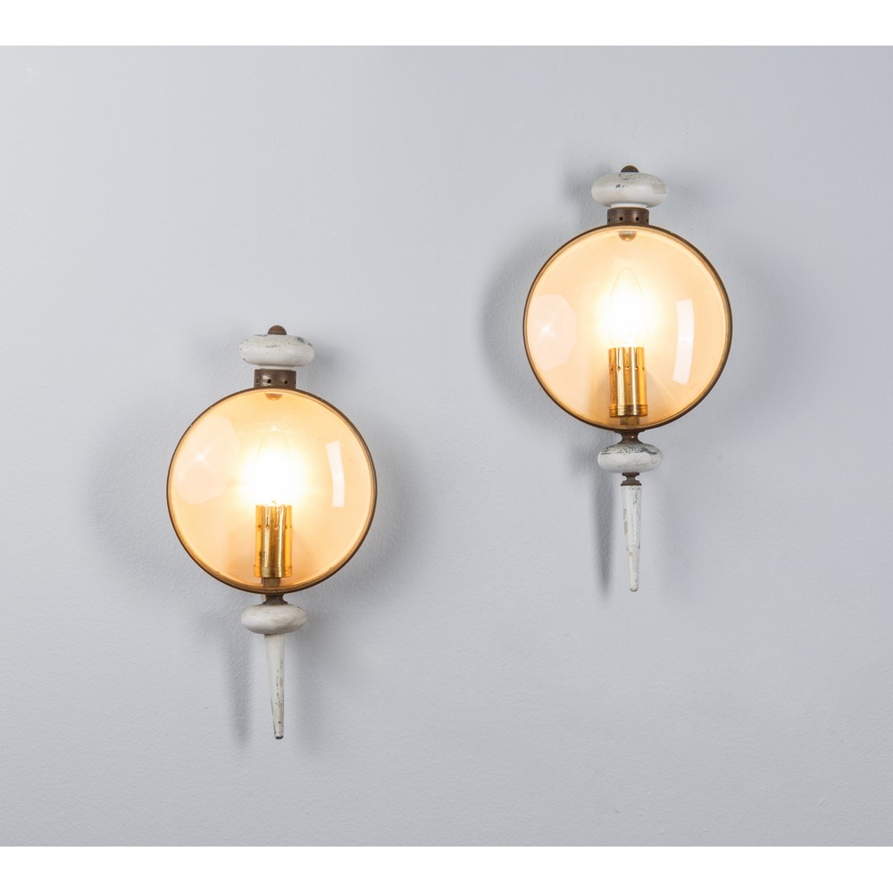Coppia di lampade da parete ad una luce, corpo a lanterna in metallo laccato bianco, portalampade e finiture in ottone, diffusore a disco in vetro trasparente bombato.