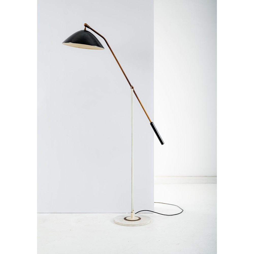 Lampada da terra ad una luce, struttura in tubolare metallico verniciato bianco, braccio orientabile in ottone con bilanciere in metallo verniciato nero, diffusore semi globulare in alluminio forato e verniciato nero e bianco, base circolare in marmo.