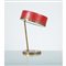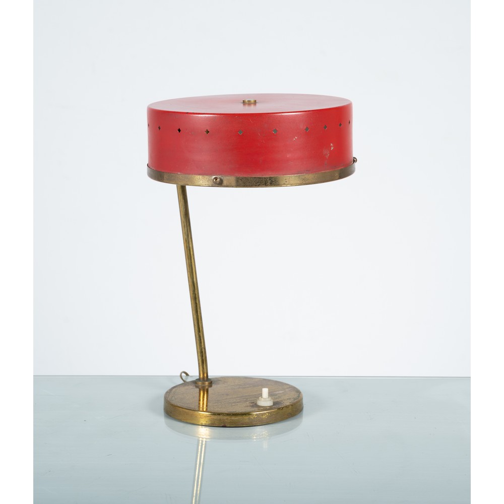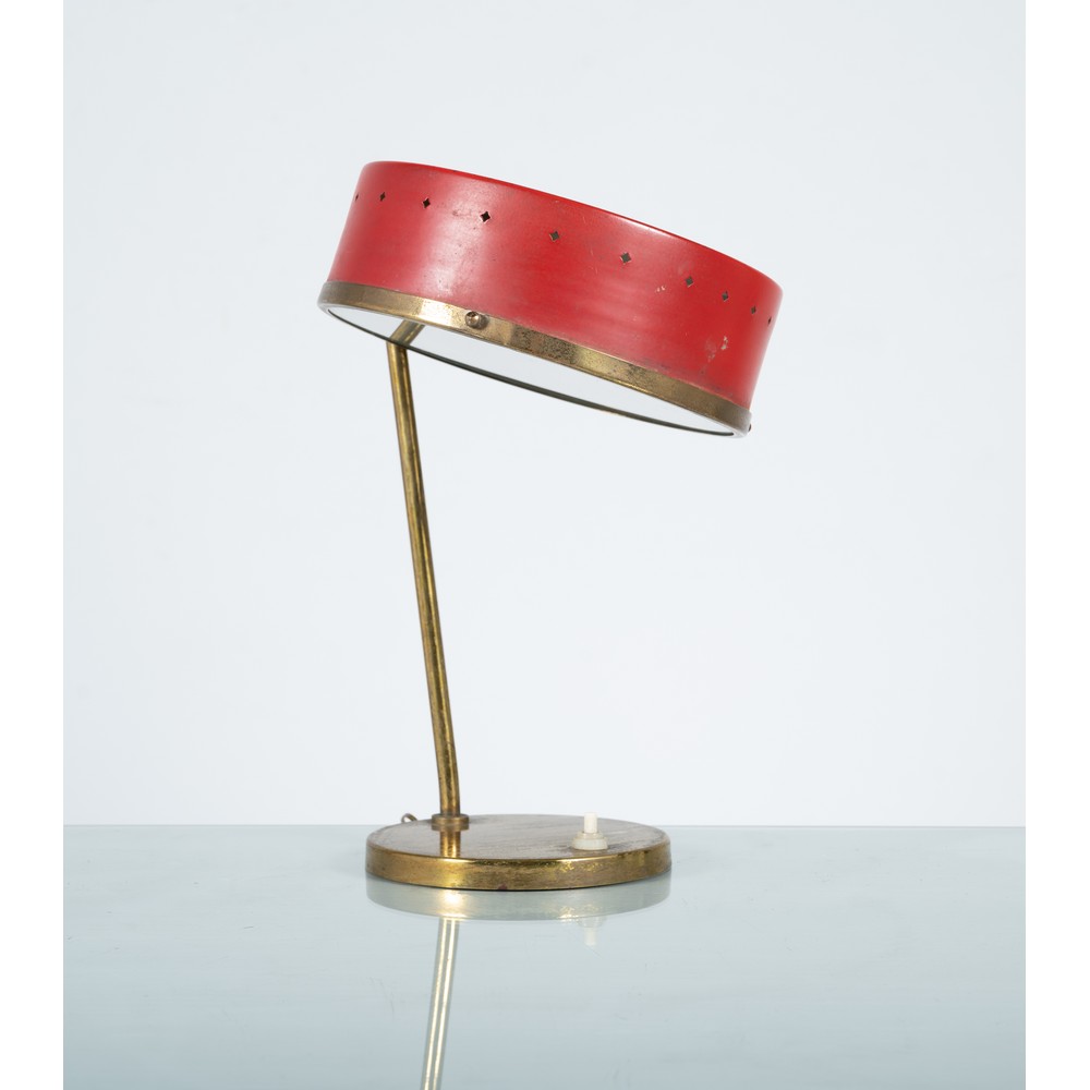 Lampada da terra ad una luce, struttura in ottone, diffusore circolare in metallo forato verniciato rosso con vetro, base circolare.