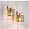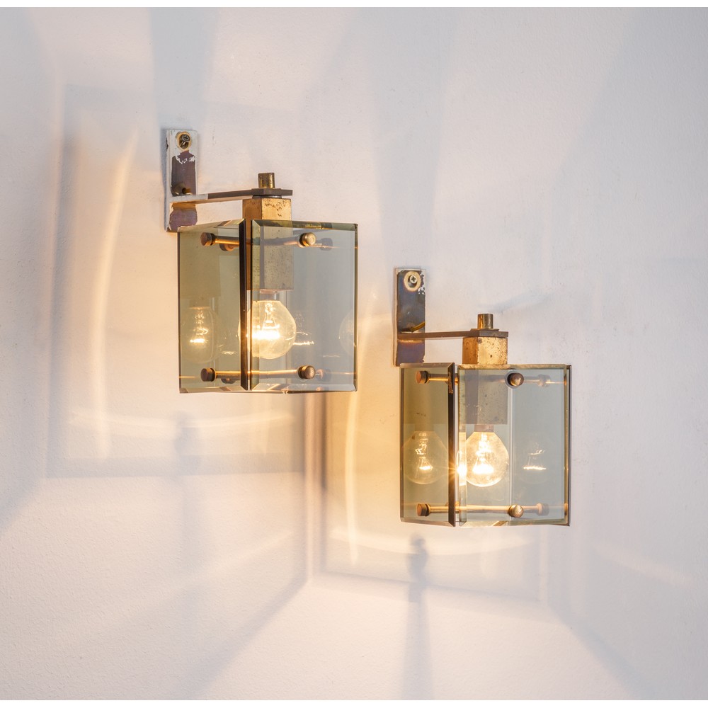 Coppia di lampade da parete ad una luce, corpo a lanterna, struttura in ottone, quattro facce in vetro fumé molato, tracce di vernice sulle parti metalliche.