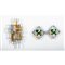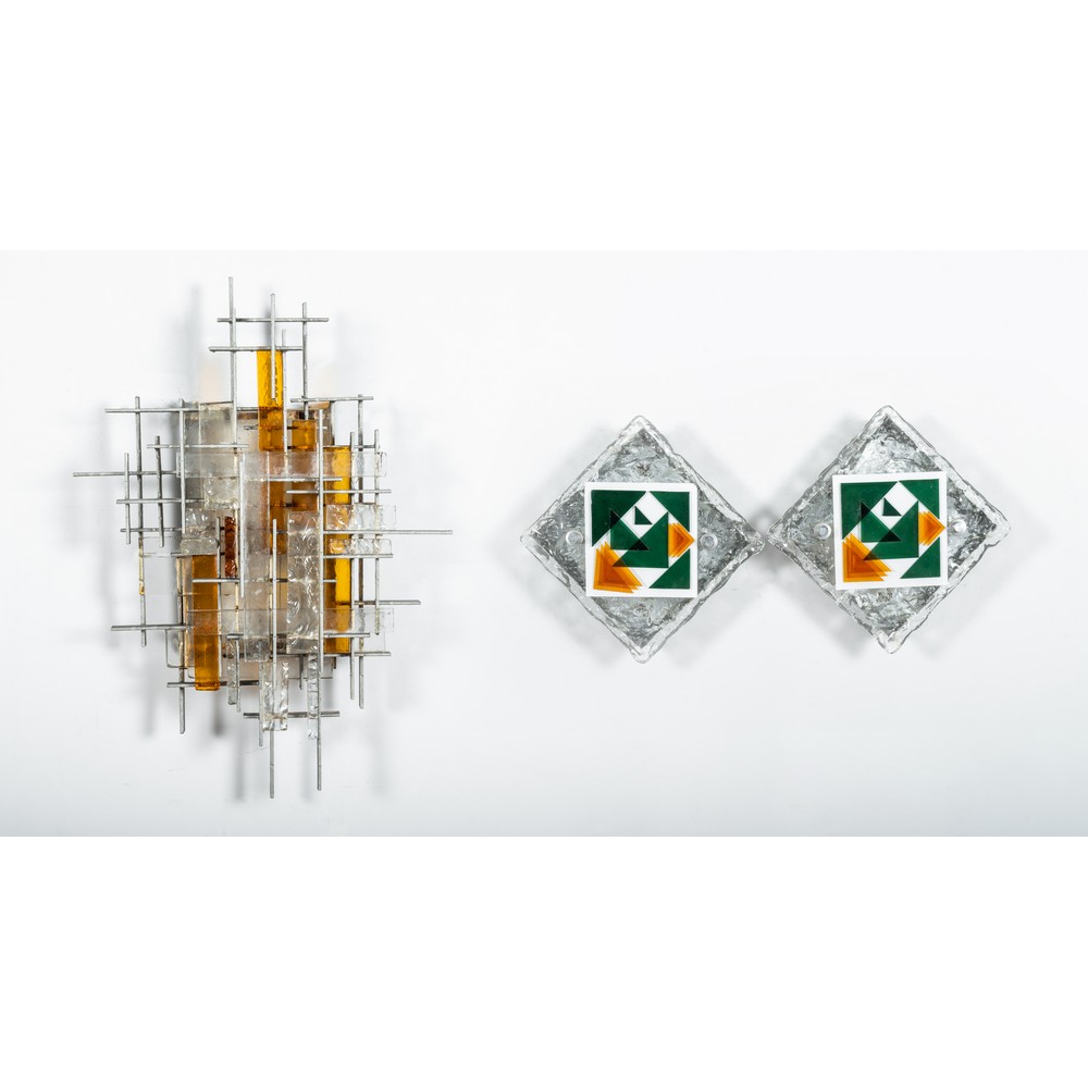 Una lampada da parete ad una luce con struttura in acciaio e decorata con prismi in vetro massello nei toni ambra e trasparente. Una coppia di lampade da parete ad una luce, corpo quadrato in vetro trasparente con decoro geometrico bianco, verde ed ambra. Difetti.