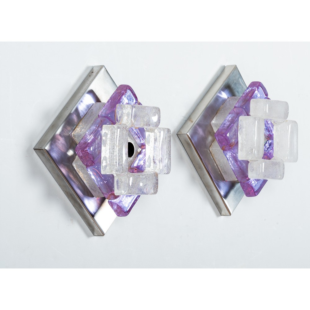 Coppia di lampade da parete ad una luce con struttura quadrata in metallo cromato e diffusore in parallelepipedi sovrapposti di vetro trasparente e viola.