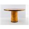 Tavolo da pranzo in legno radica di tuia, piano circolare con inserto centrale in ottone, bordo in ottone, base cilindrica con perfilo in ottone.