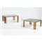 Coppia di tavoli bassi con struttura a telaio aperto in ottone, piano quadrato in vetro fumè. Ossidazioni.