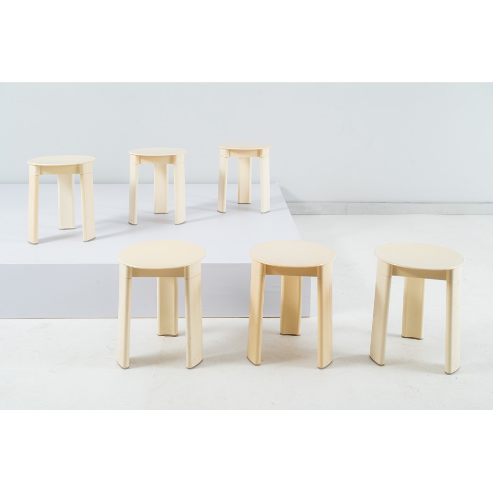 Sei sgabelli-tavoli in materiale plastico bianco, piano circolare su tre piedi.