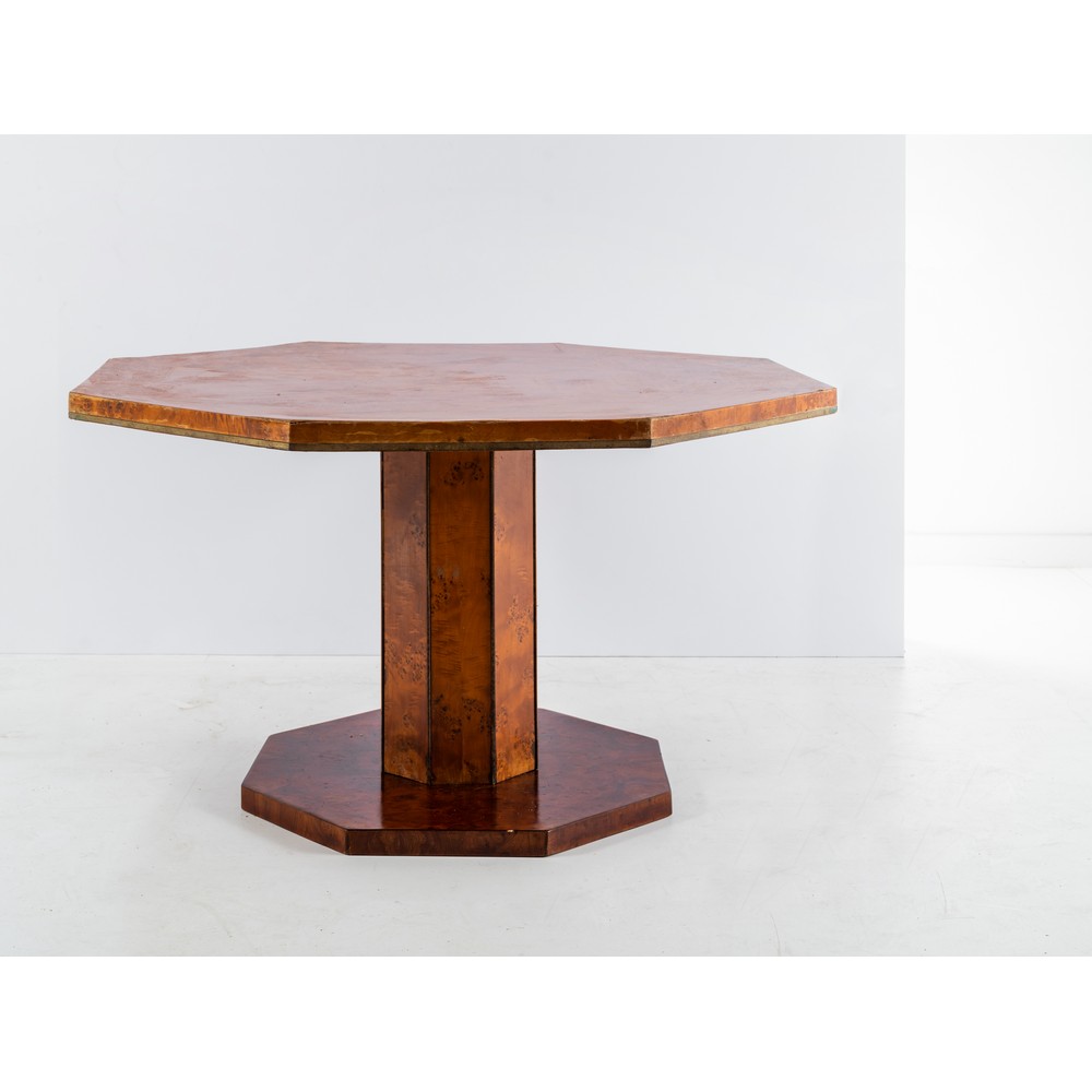 Tavolo da pranzo in legno radica, piano ottagonale con bordo inferire in ottone, piede ottagonale con inserti verticali in ottone, base ottagonale restaurata. Usure al piano.