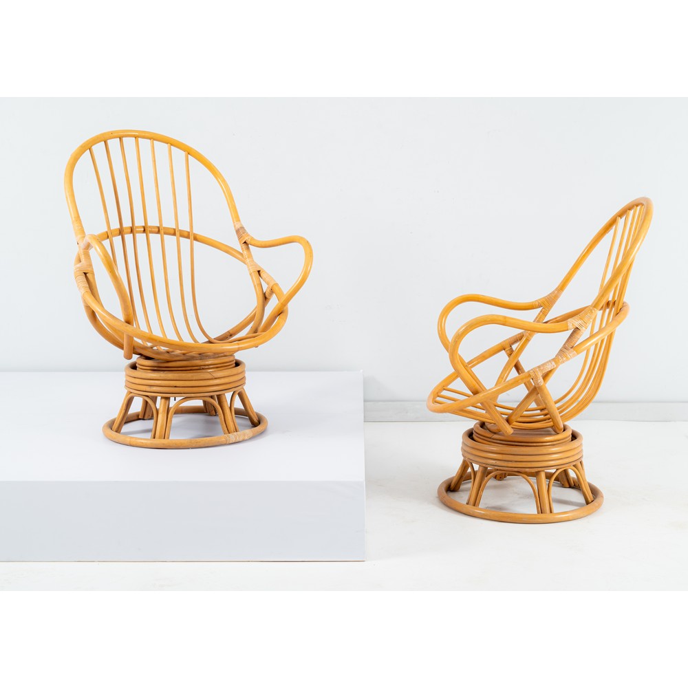 Coppia di poltrone girevoli in canna di bambù curvato e vimini.