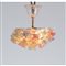 Lampada a sospensione a tre luci, corpo semisferico decorato con fiori in vetro soffiato nei toni pagliesco, rosa ed azzurrino a due luci, struttura in metallo, coppa finale a campana in vetro trasparente.