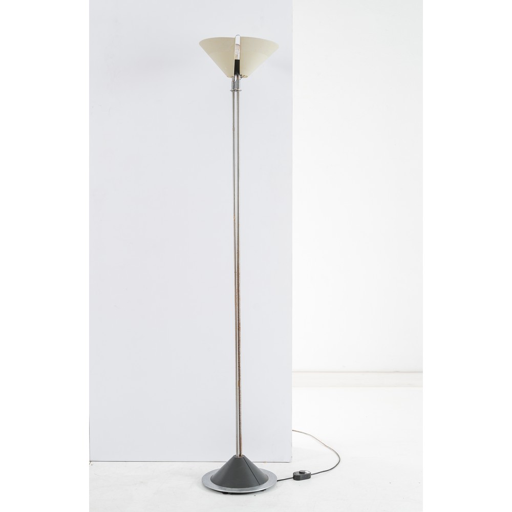 Lampada da terra modello “Sintheto” ad una luce, stelo composto da due tubolari in metallo cromato, diffusore in due parti in metallo verniciato bianco ed in parte microforato, base circolare in metallo acciaio con cono rovescio nero. Mancanza di una parte metallica nel diffusore.