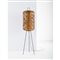 Lampada da terra ad una luce, struttura in tondino di metallo verniciato nero, piede tripode, diffusore cilindrico in rattan intrecciato, pergamena. Difetti.