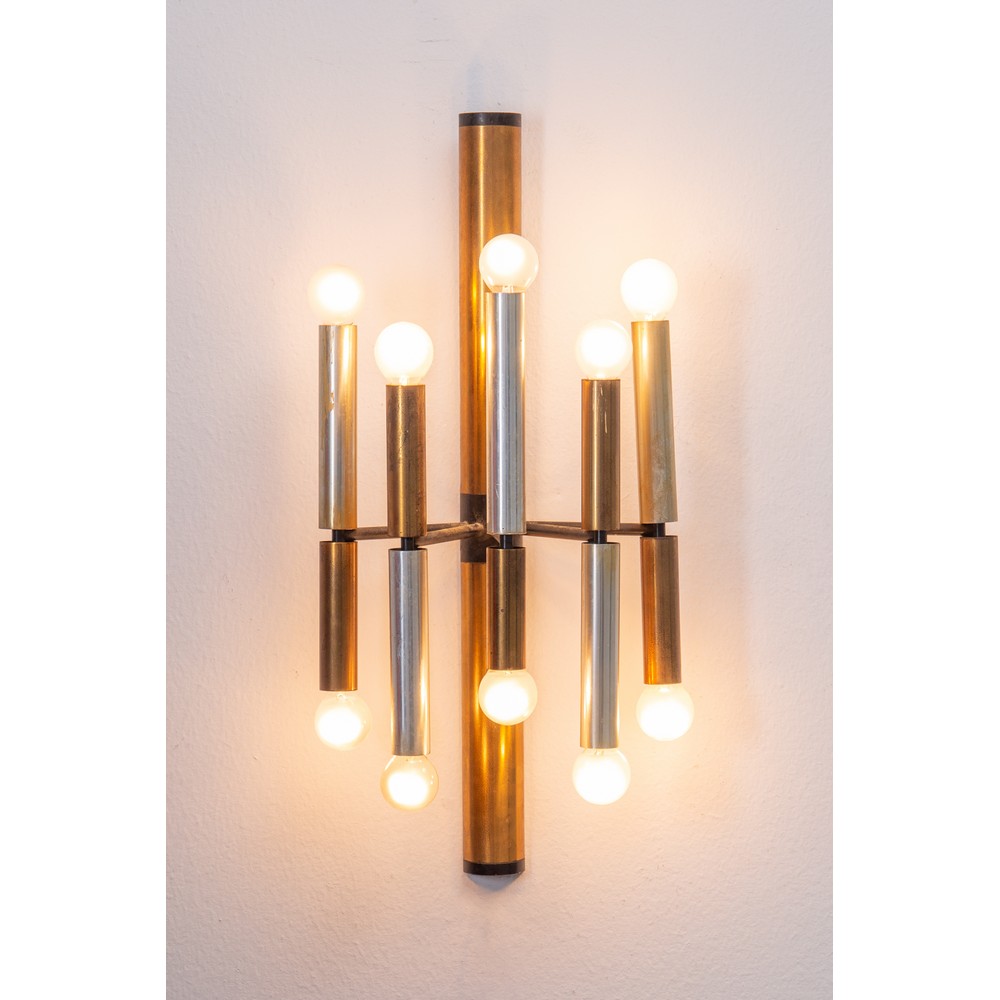 Lampada da parete a dieci luci, diffusori cilindrici in ottone ed alluminio spazzolato, metallo verniciato nero.