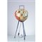 Lampada da tavolo ad una luce, struttura in tondino di metallo verniciato blu, diffusore sferico in metallo con elementi in tessuto bianco, rosso e sabbia. Difetti.